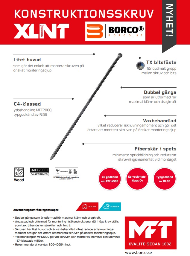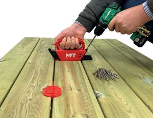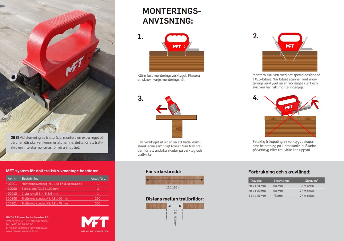 Enkel montering och snyggt resultat MFT system för dolt trallskruvmontage består av monteringsverktyg, TX15 specialbits, specialdesignad trallskruv och distansmall. Med hjälp av monteringsverktyget monteras skruven i sidan av trallbrädan - inte ovanpå - vilket ger en slät trall utan synliga skruvskallarna eller flisor! Monteringsverktyget och det specialdesignade bitset säkerställer att skruven får rätt monteringsdjup och distansmallen gör att du får samma avstånd mellan varje trallbräda. Du väljer mellan 3, 4, 5 och 6 mm. Om montaget sker utan distansmall får du en distans på 2,5 mm. MFT specialdesignad trallskruv för dolt montage är tillverkad i antingen rostfitt A2-st eller syrafast A4-stål. Under huvudet finns en gänga som skapar hög klämkraft mellan trallbräda och bärlina. Det cylinderformade huvudet ger ett minimalt synligt ingångshål i sidan av trallbrädan. Skruven har dessutom en unik spets med fiberskär som gör att du slipper förborrning. MFT system för dolt trallskruvsmontage är avsett för montering av Royal-/vanligt tryckimpregnerat, värmebehandlat trallvirke, Sibirisk lärk, m fl. Följ alltid virkesleverantörens montageanvisning gällande varje brädas avstånd. För virkesbredd: 110 - 155 mm Distans mellan varje trallbräda: 2,5 - 6 mm