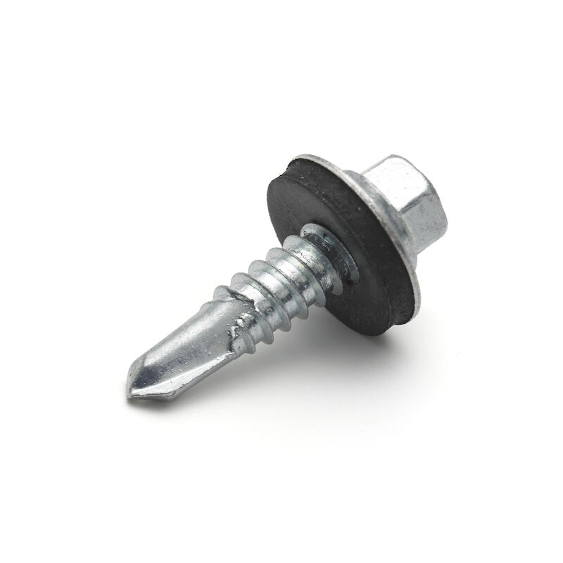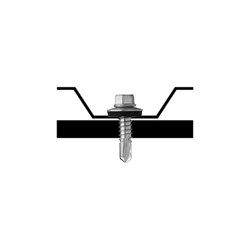Borrspets med anpassad diameter för plåt, borrar i balk upp till 6,4 mm. 6-kantshuvud med fläns för säker idragning. Tätningsbricka för säker tätning.