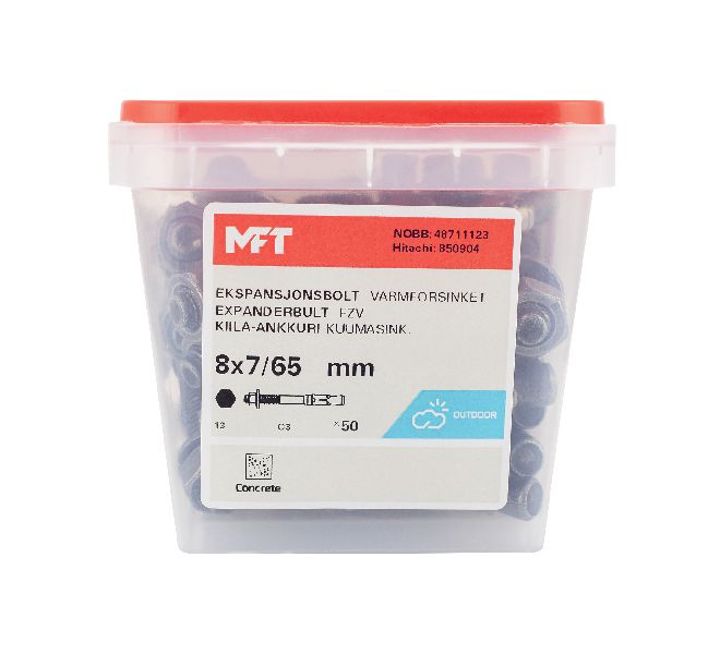 MFT Expanderbult Varmförzinkad är avsedd för inomhus och utomhus bruk. Avsedd för montage av stål, träreglar, beslag, räckverk mm mot underlag av betong. Borrhålet i betongen skall ha samma diameter som expanderbulten, dvs genomsticksmontage. Expandern slås in med hjälp av en hammare, när muttern kommer i kontakt med detaljunderlaget så låses expandern med muttern. När muttern dras åt så glider klipset upp på den koniska delen, som då skapar en expansion.