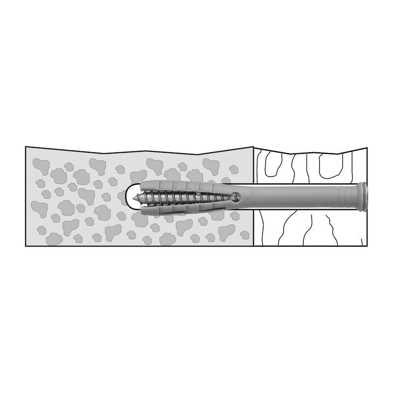 - Funktion: Solid nylonplugg med goda temperatur- och åldringsegenskaper. Fasadpluggens utformning hindrar rotation vid montering och ger möjlighet till riktad expansion. Fasadplugg KE med kort expansionsdel för massiva material som betong och massivtegel.