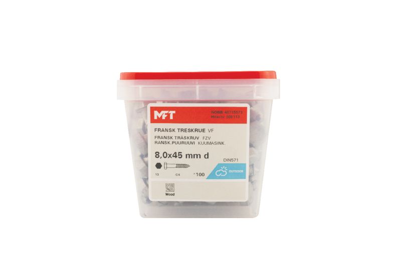 MFT Fransk träskruv med varmförzinkad ytbehandling tillverkad i kolstål, kvalitet 4.6. Korrosivitetsklass C3. Skruven är tillverkad enl. DIN 571. Sexkantshuvud och delgängad.