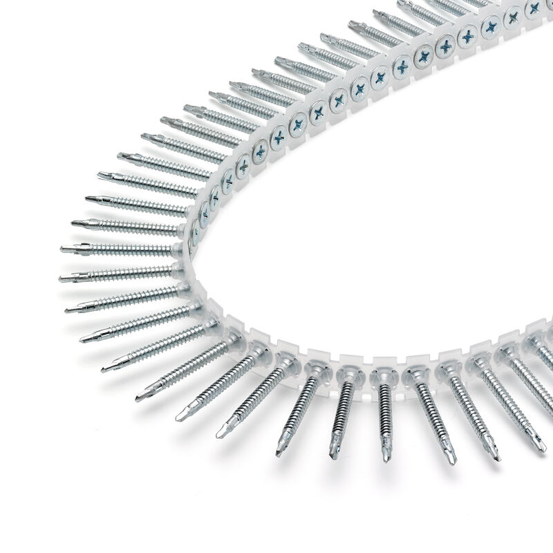 - Funktion: Borrspets och gängor anpassade för förankring i stål upp till 2 mm. Vingarna fräser upp hålet i spånskivan. När borrspetsen går igenom stålet bryts vingarna av och huvudet sjunker in i gipsskivan utan att skada pappskiktet. Lämplig vid gipsmontage där innersta skivan är av spån eller plywood.