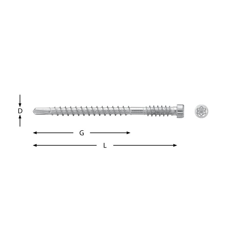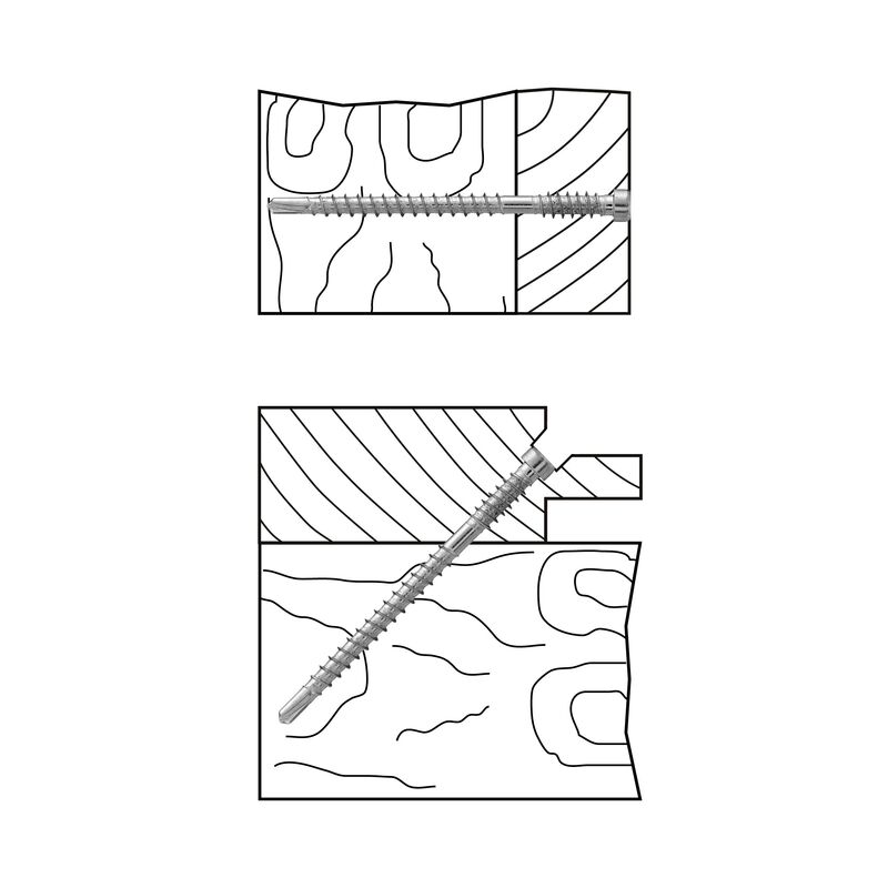 - Funktion: Patenterad design med reducerad borrspets för förankring i trä och stål upp till 1 mm. Borrspetsen förborrar och gängorna under skallen fixerar trädetaljen samtidigt som det cylindriska huvudet försänks in i materialet. Lämplig vid montage av massiva trägolv, panel, lister m.m.