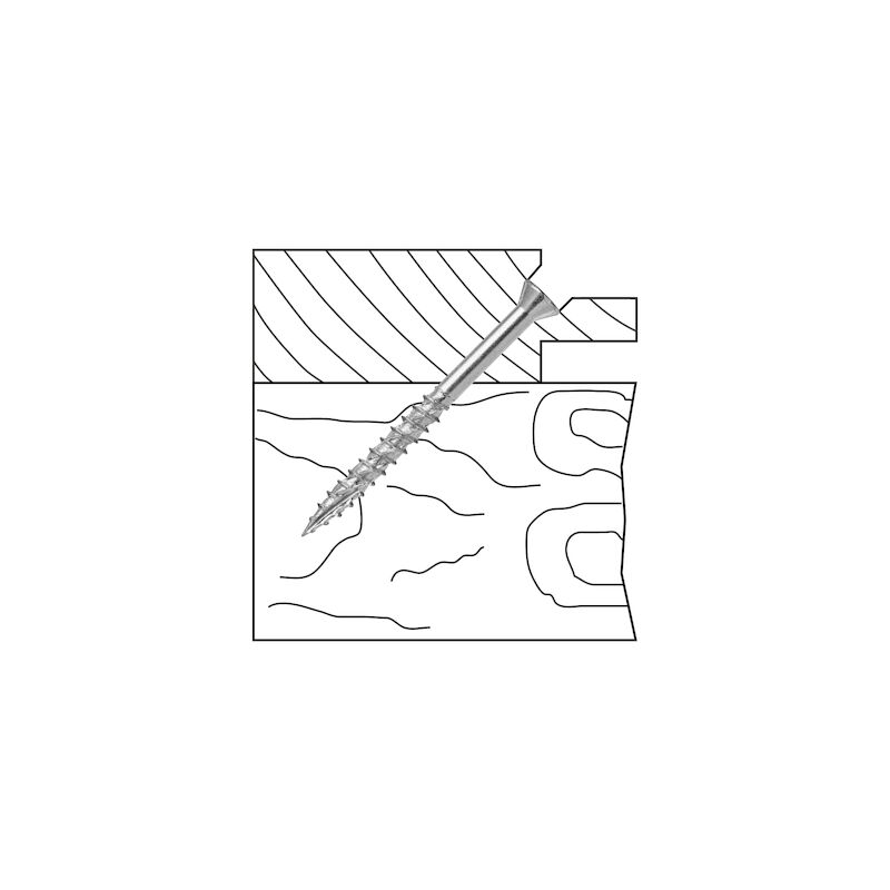 - Funktion: Vass spets och gängor anpassade för förankring i trä. Gängorna griper omedelbart och drar in skruven i trägolvet, samtidigt som huvudet sjunker in av sig självt. Skruvens unika idragningsegenskaper har uppnåtts genom att förse skruven med en skärande borrspets, samt med snedställda och längsgående skär mellan gängorna. Detta ger följande fördelar: