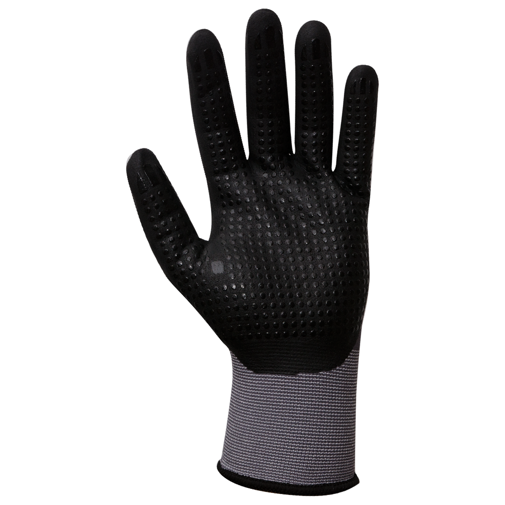 Tillverkade av nylon och spandex liner (15 gauge) i grått och belagda med en knottrig nitril för att ge