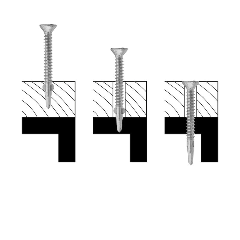 - Funktion: Borrspets och gängor anpassade för förankring i stål upp till 6 mm. Vingarna fräser upp hålet i virket. När borrspetsen går igenom stålet bryts vingarna av. Rillorna under huvudet försänker skruven.