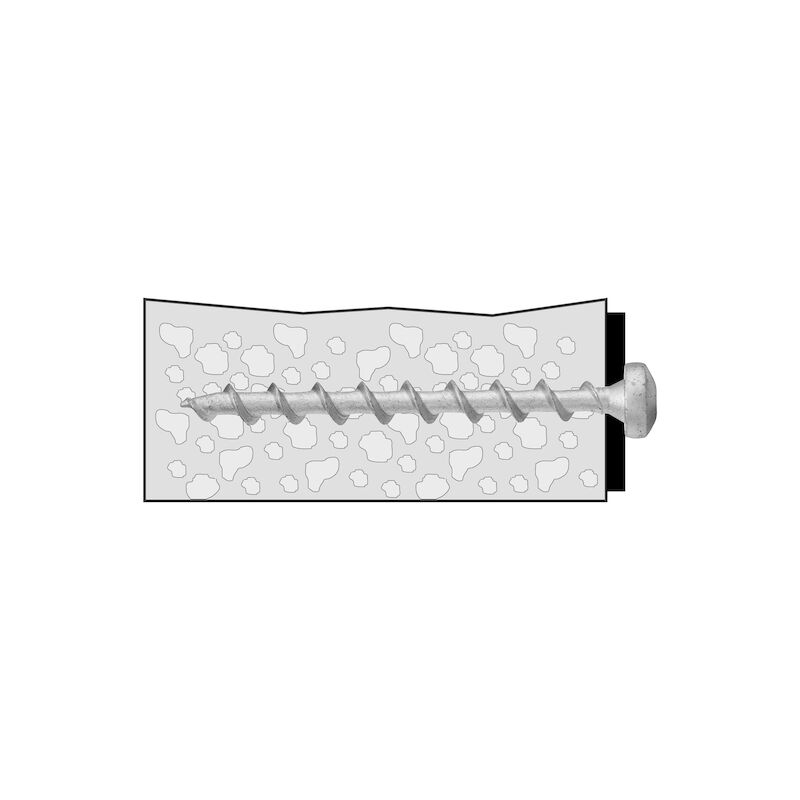 - Monteringsanvisning: Skruva i skruven utan att förborra i lättbetongen/lättklinkern, skruva med lågt moment för att inte överdra skruven. Vid osäkerhet om kvaliteten på lättbetongen/ lättklinkern bör provdragning utföras.