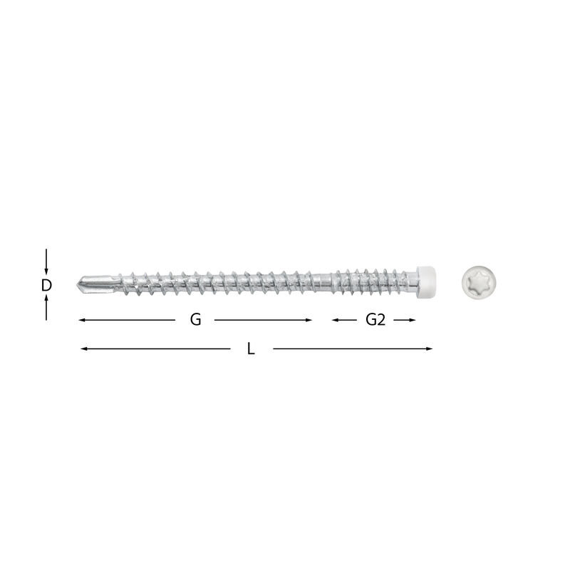 - Funktion: Patenterad design med reducerad borrspets för förankring i trä- och stålregel upp till 1 mm. Borrspetsen förborrar och gängorna under skallen fixerar trädetaljen samtidigt som det cylindriska huvudet försänks in i materialet. Lämplig vid montage av lister, panel, trädetaljer m.m.