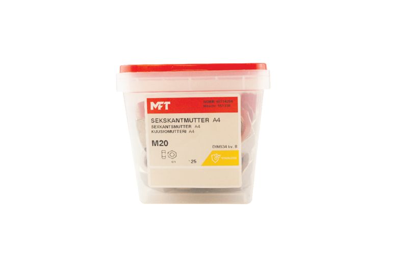 MFT Sexkantsmutter M6M i dim. M20 är tillverkad enligt DIN934/ISO4032 standard av syrafast stål, kvalitet A4-70.