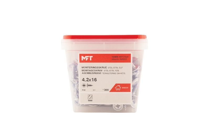 MFT Montageskruv är avsedd för montage mot underlag av trä eller stål mot stål, max. 1,2mm. För inomhus bruk.