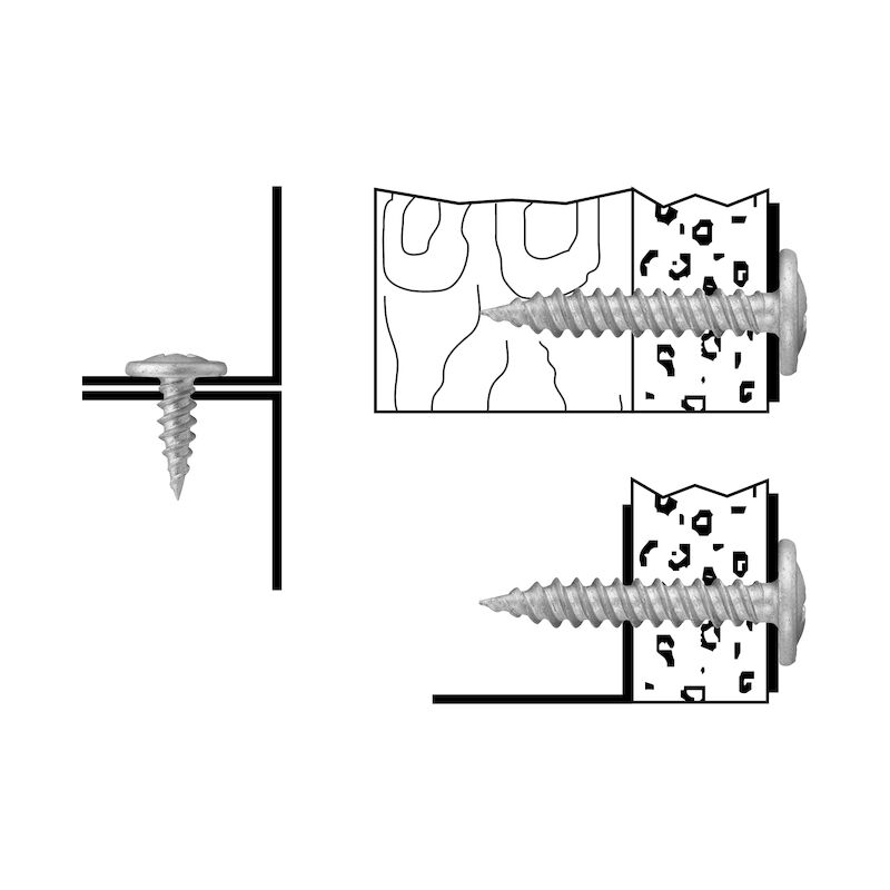 - Funktion: Vass spets med dubbelledande gängor som griper omedelbart i trä- och stålregeln. Lämplig vid montage där ett plant huvud krävs och för att fästa plåt mot plåt.