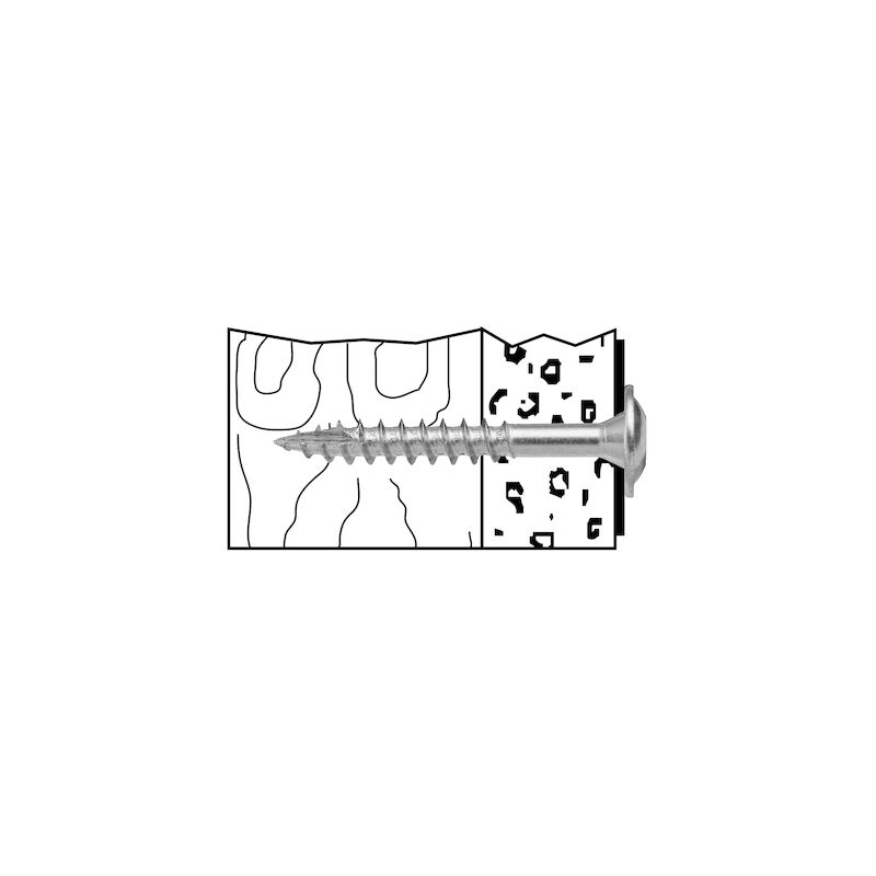 - Funktion: Vass spets och gängor anpassade för förankring i trä. Skruven har även en skärande borrspets för att förhindra sprickbildning i trä. Lämplig vid montage där ett plant huvud krävs.