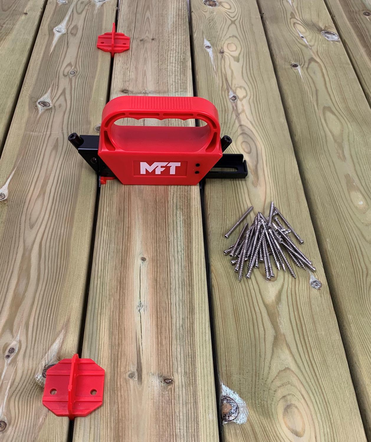 MFT System för dolt trallskruvsmontage. Verktyget kläms fast över brädan och har en låsfunktion vilket ger ett mycket stabilt montage. Montaget sker tillsammans med MFT special anpassade TX15 bits och MFT special designade rostfri syrafasta trallskruv. Skänklarna som klämmer om trallbrädan ger en distans mellan varje trallbräda på 2,5 mm, om annat avstånd önskas så medföljer det 2 st avståndsmått i varje förpackning. Distansmallen ger en möjlighet till 3,0/4,0/5,0 eller 6,0mm avstånd mellan trallbrädorna. Trallskruven monteras i sidan av brädan vilket skapar ett dolt montage, inga synliga skruvskallar är att trallen blir fri från sprickor och stickor som annars kan uppstå vid traditionellt montage. För virkesbredd 110 - 155mm.