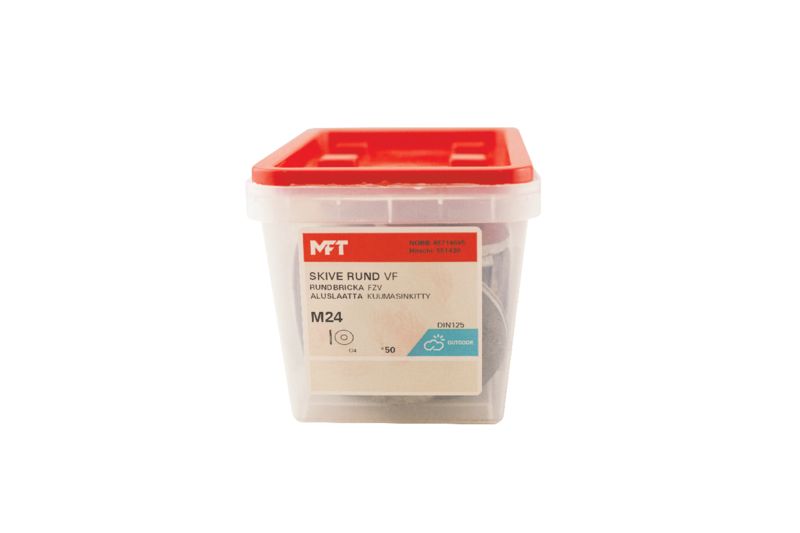 MFT Planbricka rund är tillverkad enligt DIN125 standard i härdat kolstål. Brickan har en varmförzinkad ytbehandling.