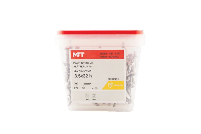 MFT Plåtskruv med kullrigt huvud RXS är avsedd för montage mot underlag av trä eller mot tunnplåt. För inomhus och utomhusbruk