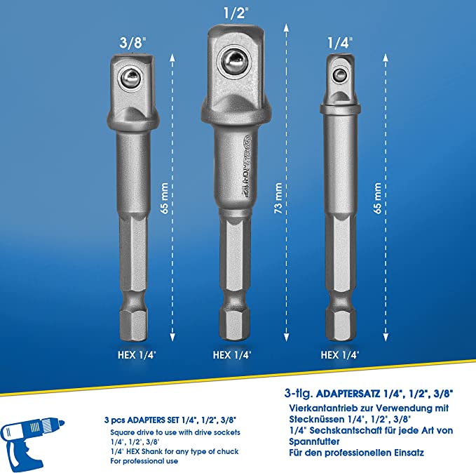 Längden på socket adaptrar: 1/4 tum – 65 mm; 3/8 tum – 65 mm; 1/2 tum – 73 mm
