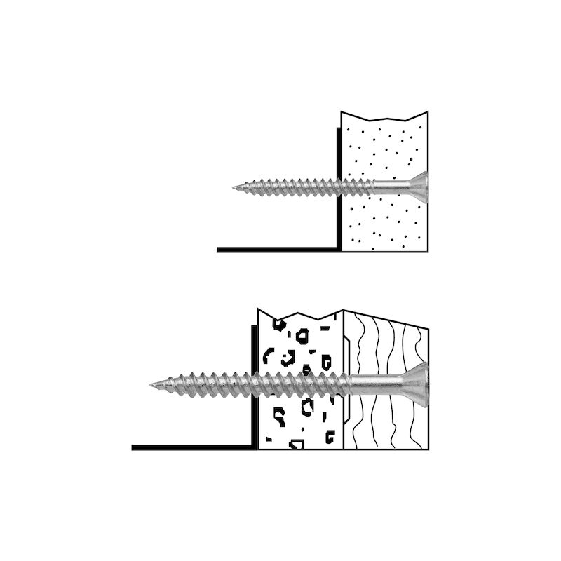 - Funktion: Vass spets med dubbelledande gängor som griper omedelbart och går igenom stålregeln snabbt. Rillorna under huvudet försänker skruven i skivan. Lämplig för montage av spånskiva, OSB, plywood och andra träbaserade skivor mot stålregel max 1 mm och mot träregel.