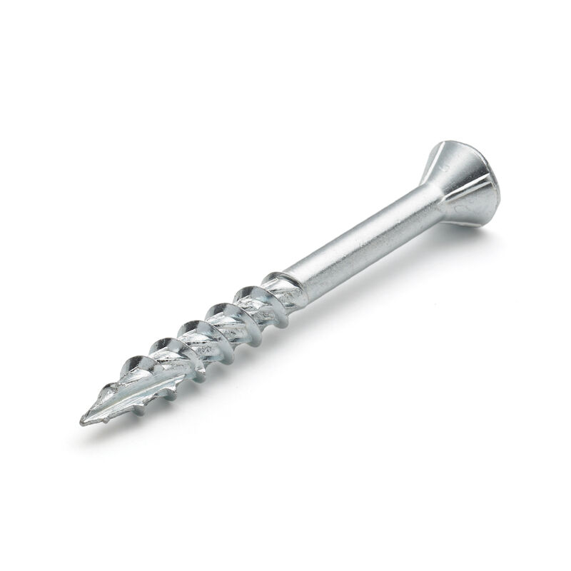 Vass spets och gängor anpassade för förankring i trä. Gängorna griper omedelbart och drar in skruven i spånskivan