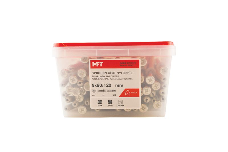 MFT Spikplugg är avsedd för är avsedd för lättare montage av läkt, socklar, listverk, foder, inredningsdetaljer, skåp mm. i material som betong, fulltegel och natursten. Genomsticksmontage, förborra och slå in med hjälp av vanlig hammare. Pluggens design ger en chockexpansion vid montaget och är ej avsedd för Leca eller Siporex. Nylonprodukter skall inte användas i takkonstruktioner pga. temperaturområde upp till max +80°C om brand skulle utbryta.