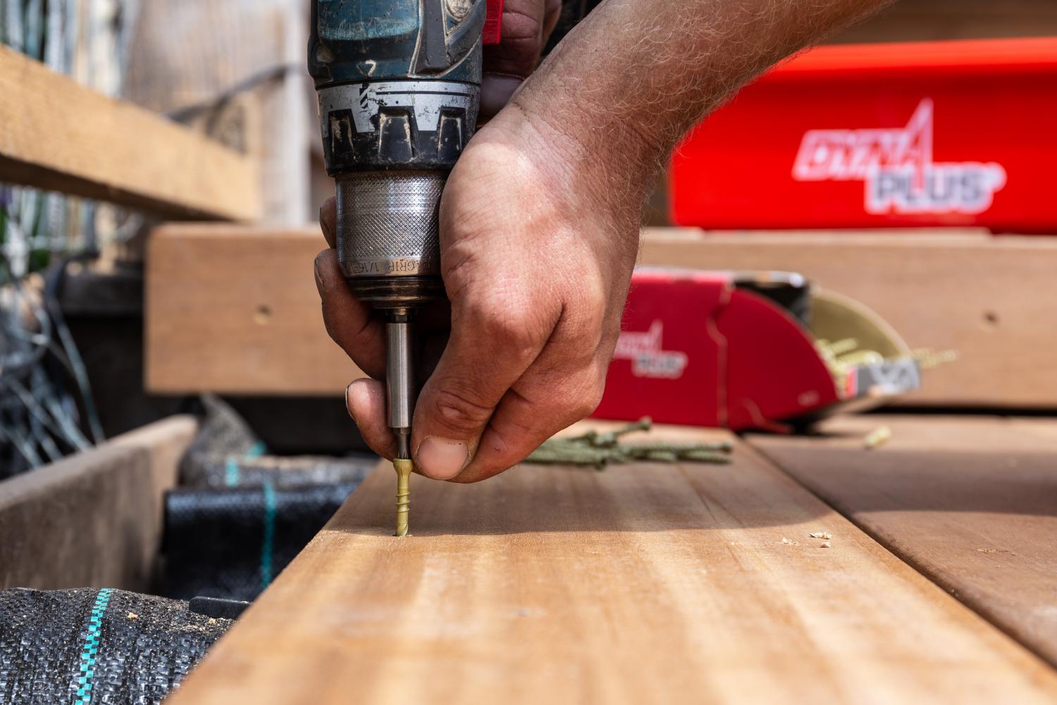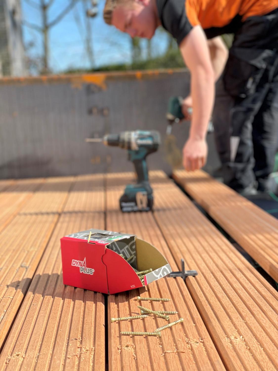 Dynaplus® trallskruven har förbättrats; genom att lägga till en extra bit skruvgänga precis under skruvhuvudet hålls trädäcksbrädan ännu bättre. När träplankan börjar arbeta efteråt kan dessutom skruven arbeta sig upp ur träet mindre snabbt. Dessutom har den beprövade och hyllade Dynaplus®-däckskruven förblivit oförändrad. Dynaplus® trallskruven är superstark, eftersom den är något tjockare än en vanlig 5,0 mm skruv. Tack vare det integrerade smörjmedlet i AR-beläggningen vrids skruven fortfarande mycket lätt. För att förhindra brott efter att skruvarna har skruvats in behöver skruvarna förutom styrka tillräcklig flexibilitet. Dessa skruvar i härdat ståltäck kan böjas upp till en vinkel på 90 grader utan att gå av. Med denna flexibilitet passar skruvarna bearbetningen av träet. Den bronsfärgade Anti-Rost-beläggningen säkerställer korrosionsbeständighet och med detta faller de fint i färg på trädäcket.