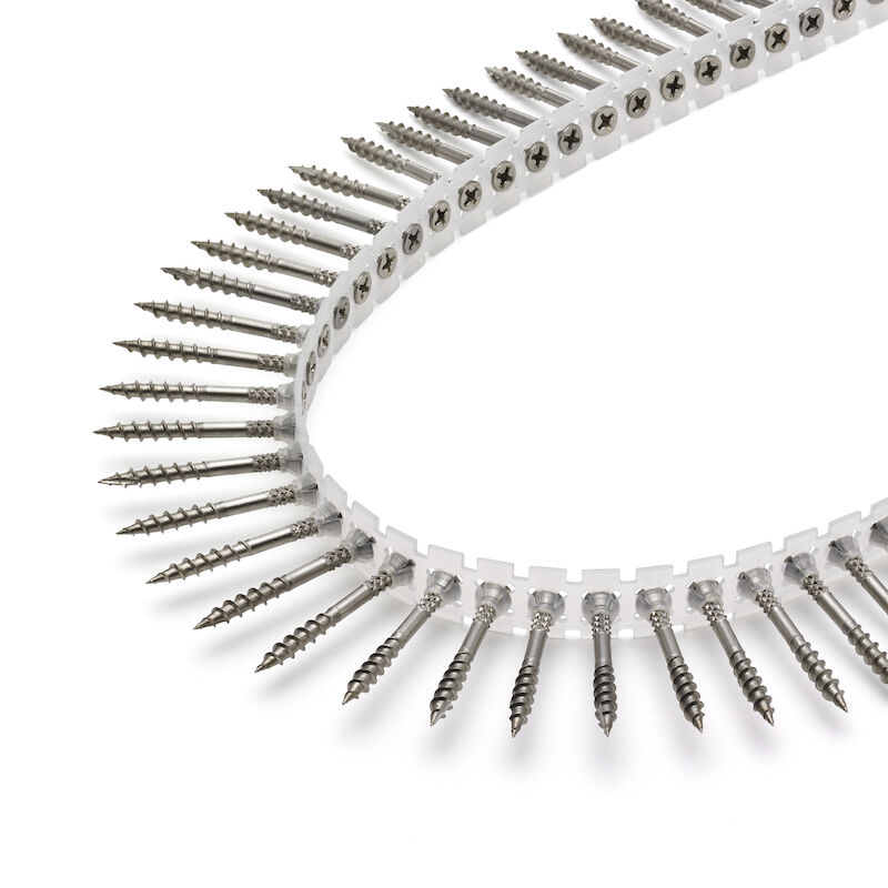 - Funktion: Vass spets och gängor anpassade för förankring i trä. Gängorna griper omedelbart och drar in skruven i trallen, samtidigt som rillorna under huvudet försänker skruven. Skruven har även en skärande borrspets för att förhindra sprickbildning i trä. Lämplig vid montage av trall, altaner, staket m. m.