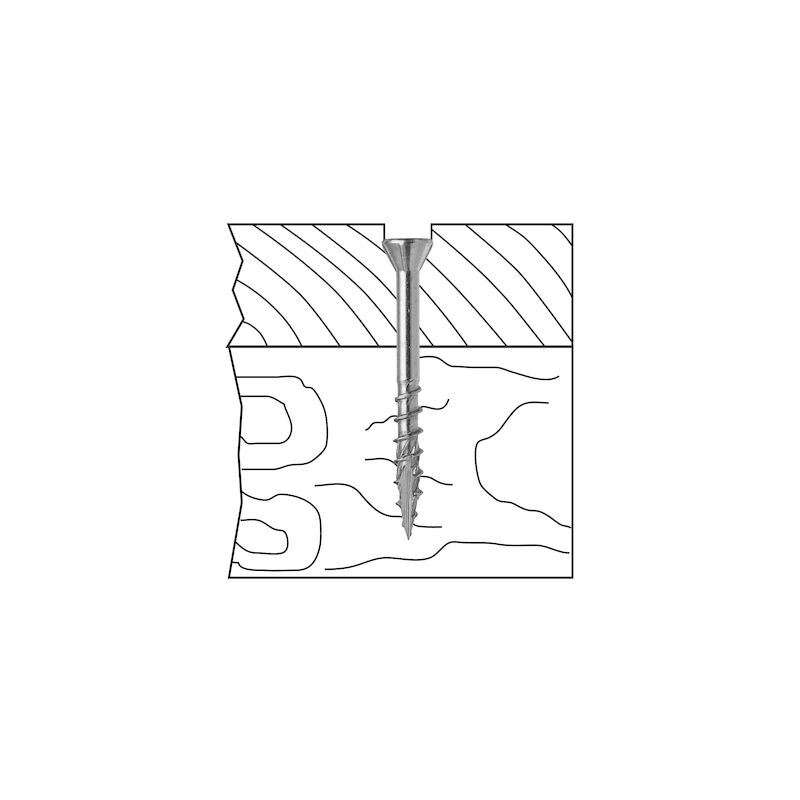 Vass spets och gängor anpassade för förankring i trä. Gängorna griper omedelbart och drar in skruven i trallen
