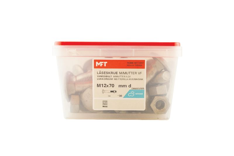 MFT Vagnsbult med mutter används för sammanskruvning av träreglar, boardmaterial mot underlag av trä eller stål. Under den kupolformade skallen så är det en fyrkantig del som fungerar som en låsning i det mjukare materialet då sammanskruvning sker. För inomhus och utomhus bruk.