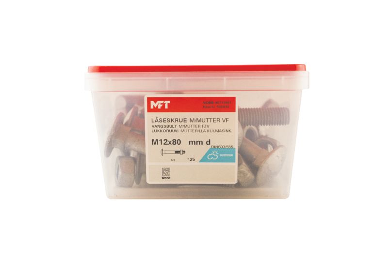 MFT Vagnsbult med mutter används för sammanskruvning av träreglar, boardmaterial mot underlag av trä eller stål. Under den kupolformade skallen så är det en fyrkantig del som fungerar som en låsning i det mjukare materialet då sammanskruvning sker. För inomhus och utomhus bruk.