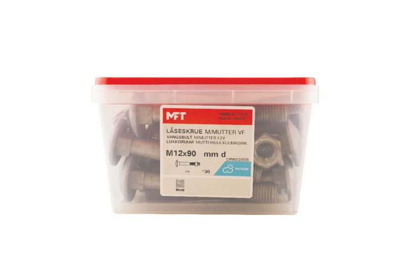 MFT Vagnsbult med mutter används för sammanskruvning av träreglar, boardmaterial mot underlag av trä eller stål. Under den kupolformade skallen så är det en fyrkantig del som fungerar som en låsning i det mjukare materialet då sammanskruvning sker. För inomhus och utomhus bruk.