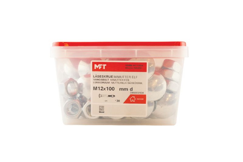 MFT Vagnsbult med mutter används för sammanskruvning av träreglar, boardmaterial mot underlag av trä eller stål. Under den kupolformade skallen så det en fyrkantig del som fungerar som en låsning i det mjukare materialet då sammanskruvning sker.