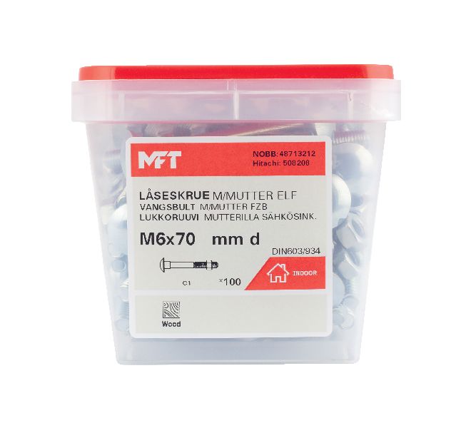 MFT Vagnsbult med mutter används för sammanskruvning av träreglar, boardmaterial mot underlag av trä eller stål. Under den kupolformade skallen så det en fyrkantig del som fungerar som en låsning i det mjukare materialet då sammanskruvning sker.